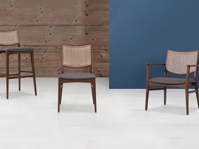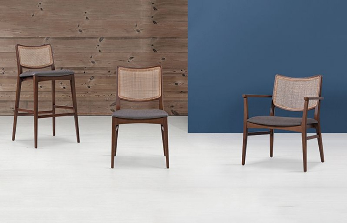 - Cadrul este din lemn masiv de fag, șezutul tapițat și spătarul din răchită, care conferă un aspect distinctiv acestei colecții.