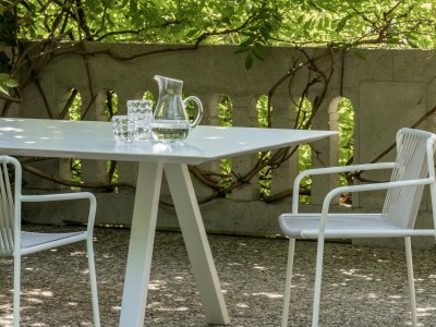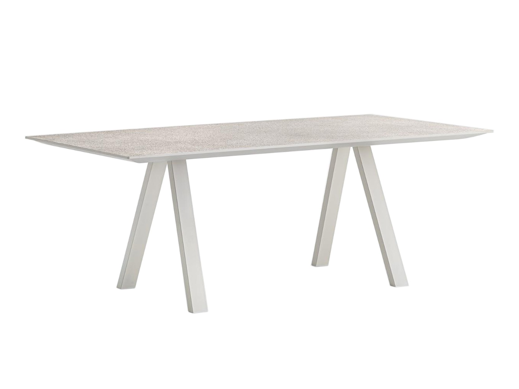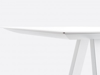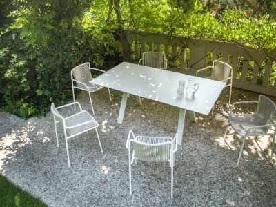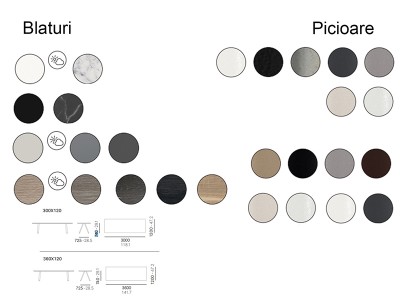 - Masă cu picioare de oțel și blat susținut de un cadru din aluminiu extrudat.