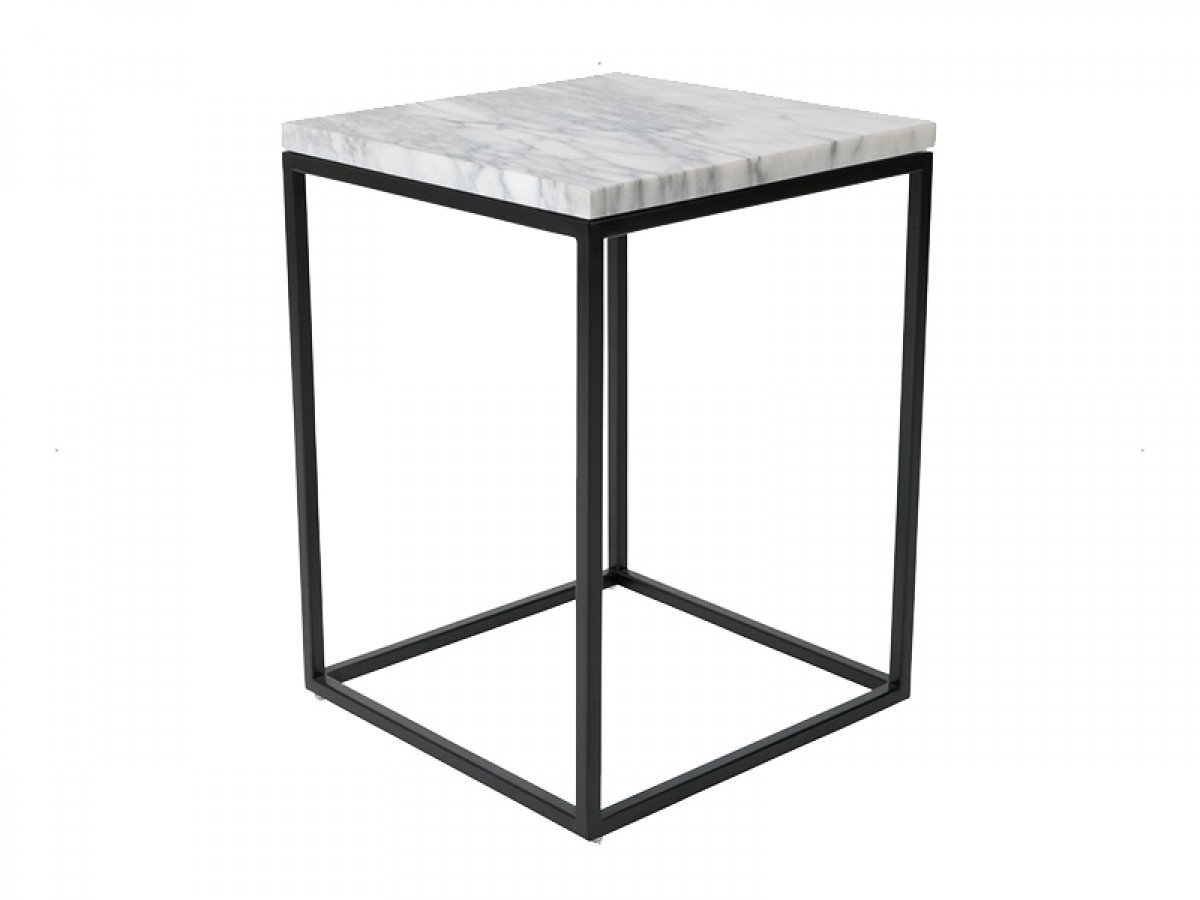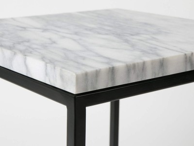- Măsuță de cafea cu bază cubică din oțel și blat de marmură albă.