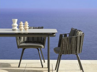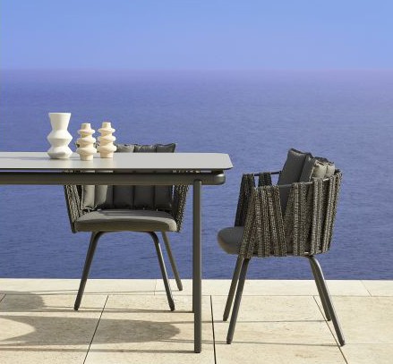- Are o structură lăcuită din aluminiu, cu perne și tapițerie potrivite pentru exterior și suport din panglică împletită pe tuburi de aluminiu.