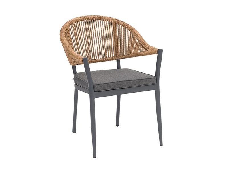 Scaunul are un cadru solid din aluminiu antracit și este acoperit cu rafie rezistentă la UV, care oferă un aspect unic.