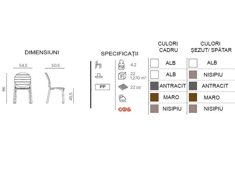 - Scaun fără brațe din polipropilenă.