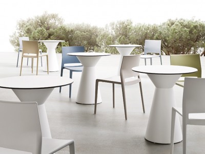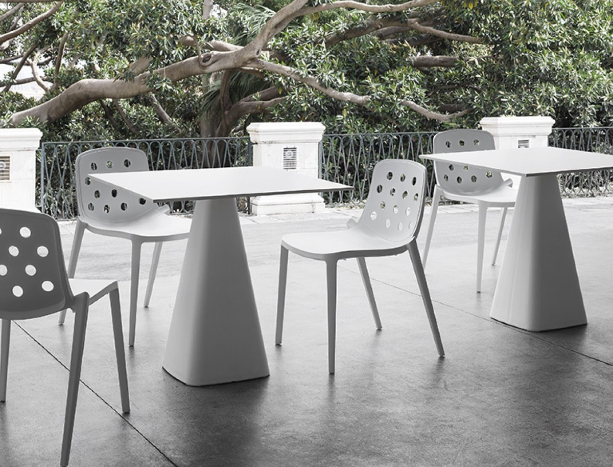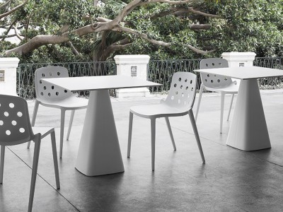 - Masă de outdoor realizată din tehnopolimer și blat compact, disponibilă în mai multe nuanțe de culori.