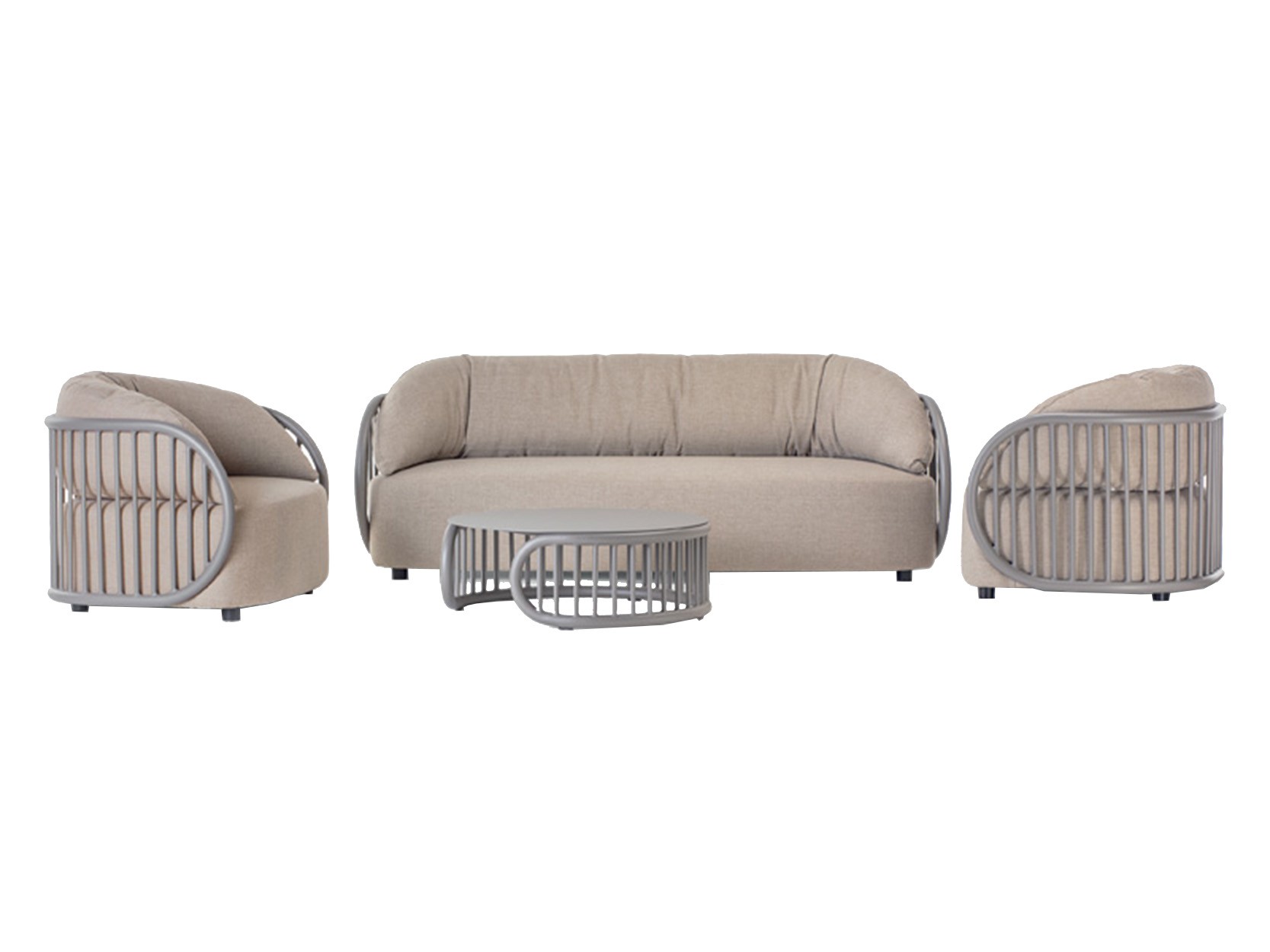 - Set terasă cu structură din aluminiu, compus din două fotolii, un divan și o măsuță cu blat din aluminiu.