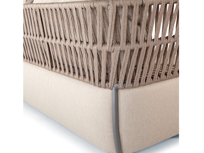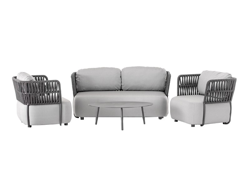- Set realizat din aluminiu și îmbrăcat în frânghie de poliolefină, compus dintr-o canapea de 2 locuri, două fotolii și o masă de cafea cu blat din aluminiu.
