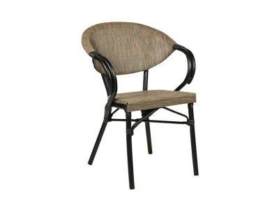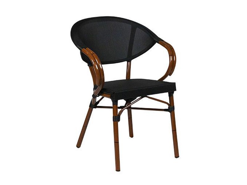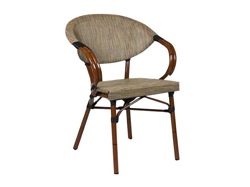 Scaunul, potrivit pentru terasă, are un cadru din aluminiu de calitate superioară, cu un aspect de lemn și un material textil rezistent la UV.