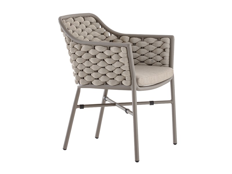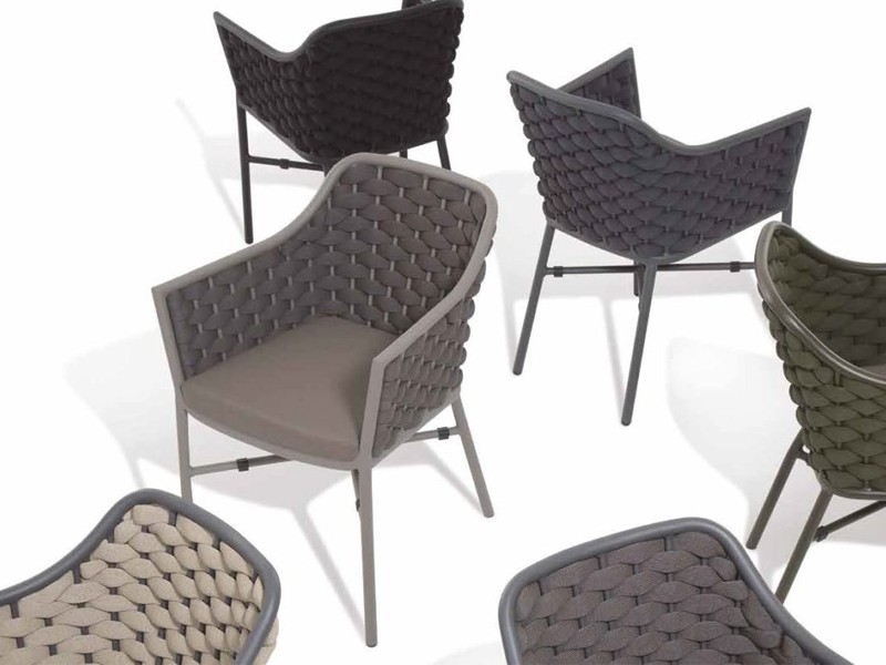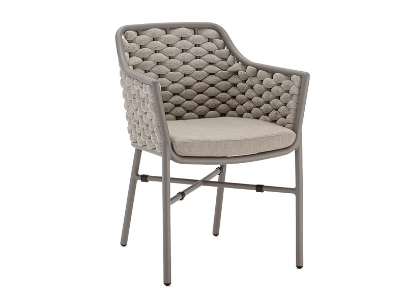 - Scaun cu brațe pentru terasă, ce îmbină armonios structura din aluminiu cu materialul textil împletit.