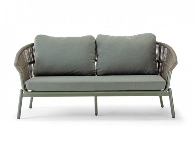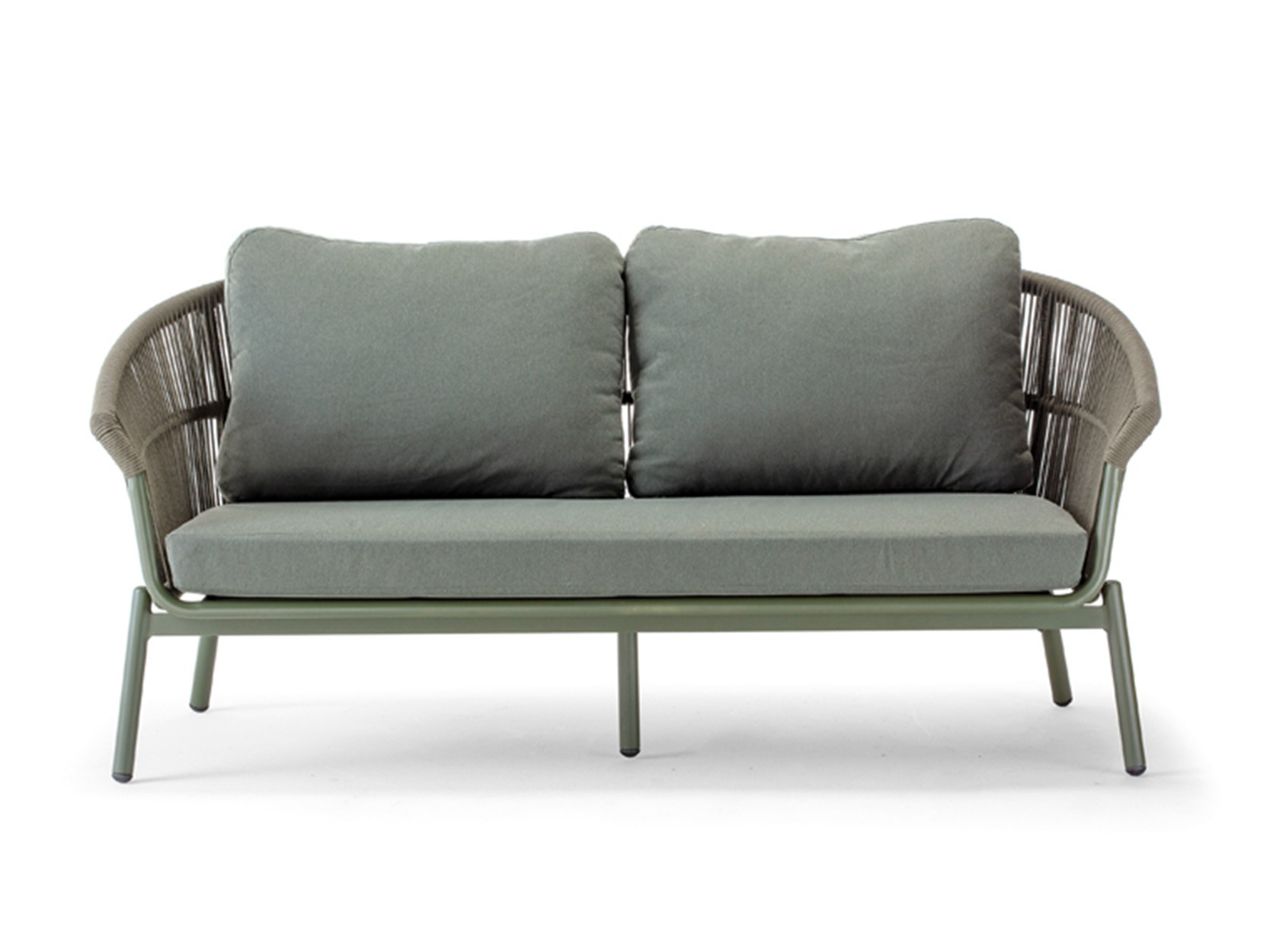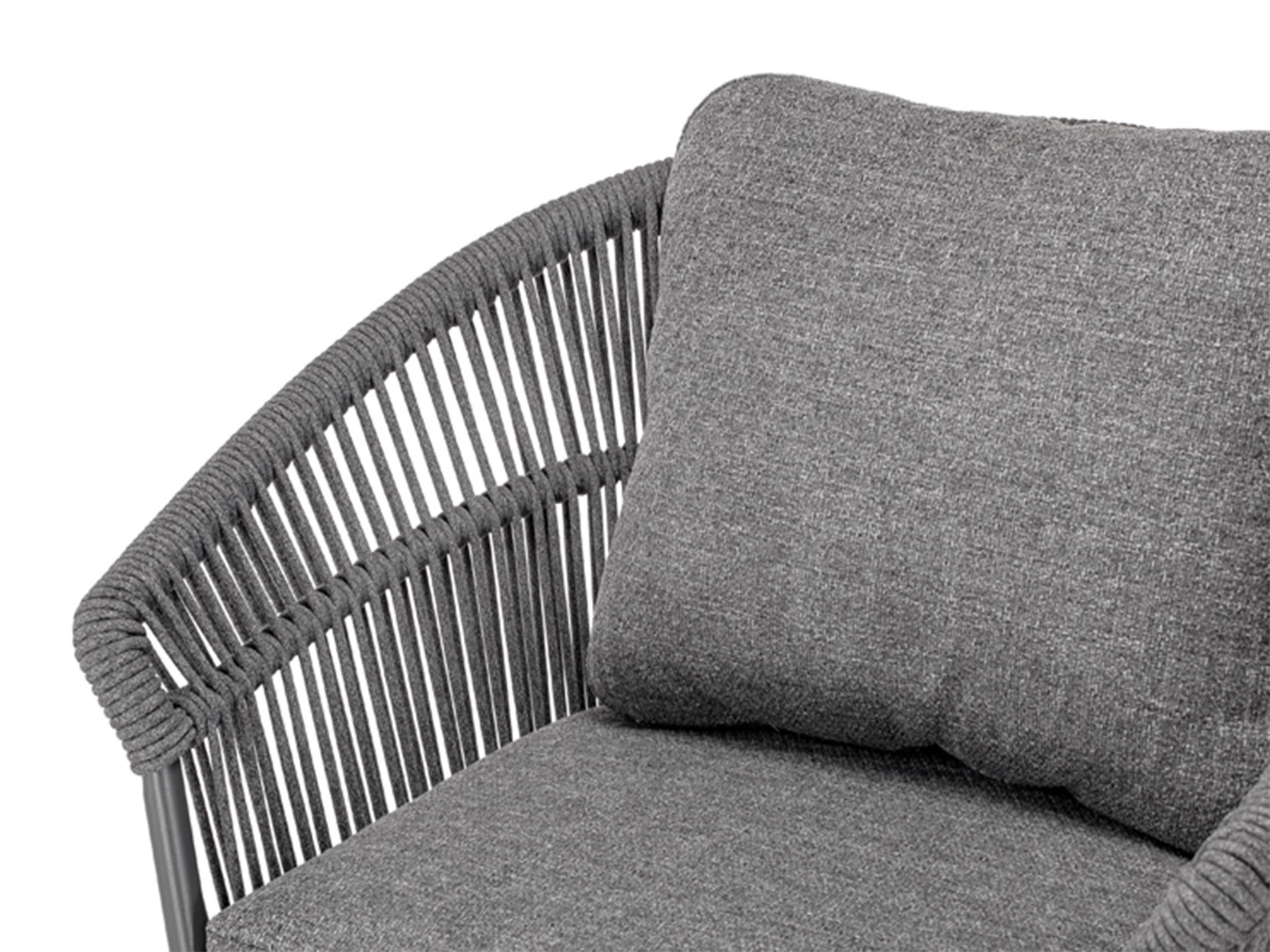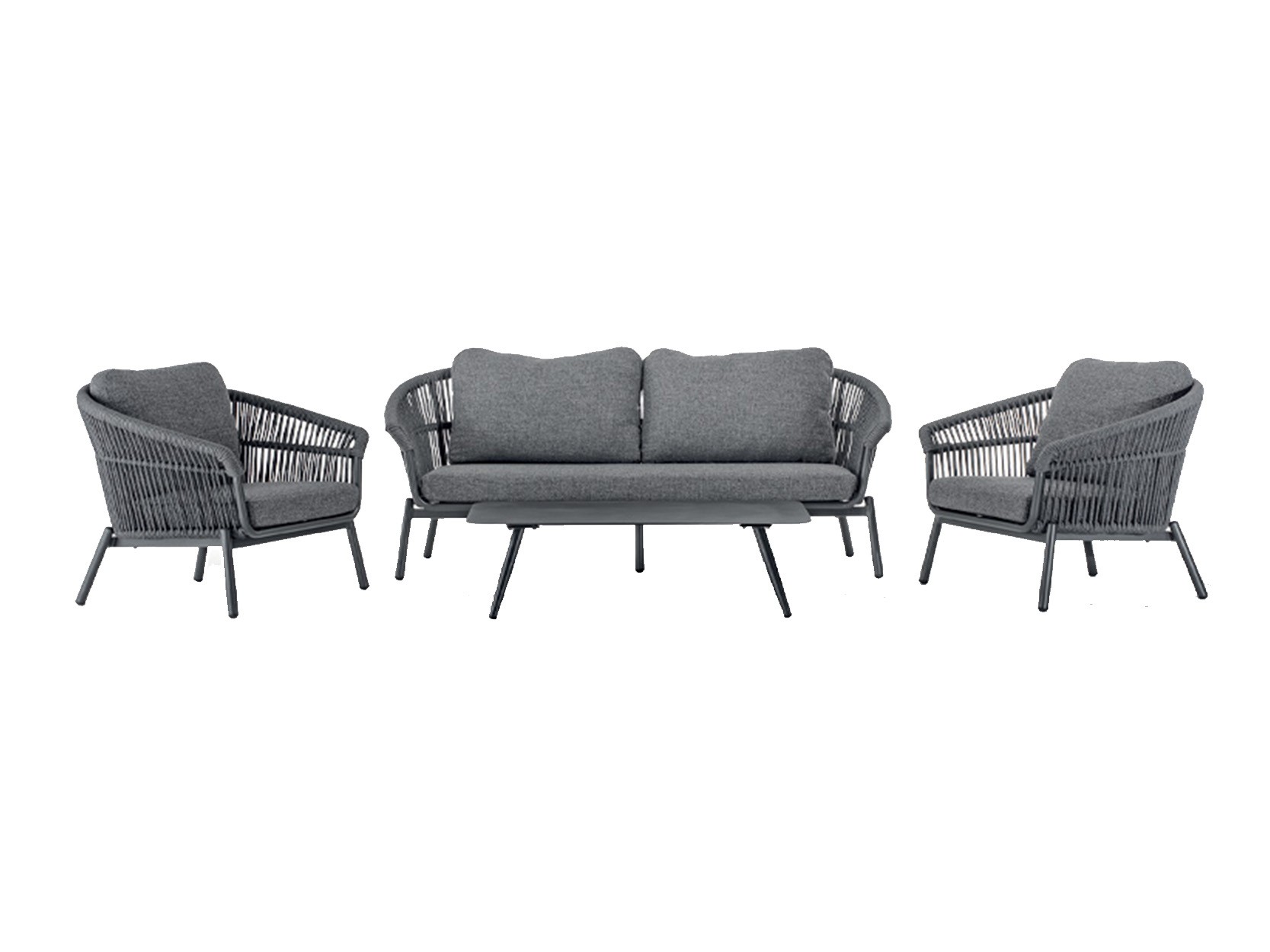 - Set de lounge cu structură din aluminiu și tapițerie din frânghie textilene de Ø 8 mm, compus din două fotolii, un divan cu două locuri și o măsuță cu blat din aluminiu.