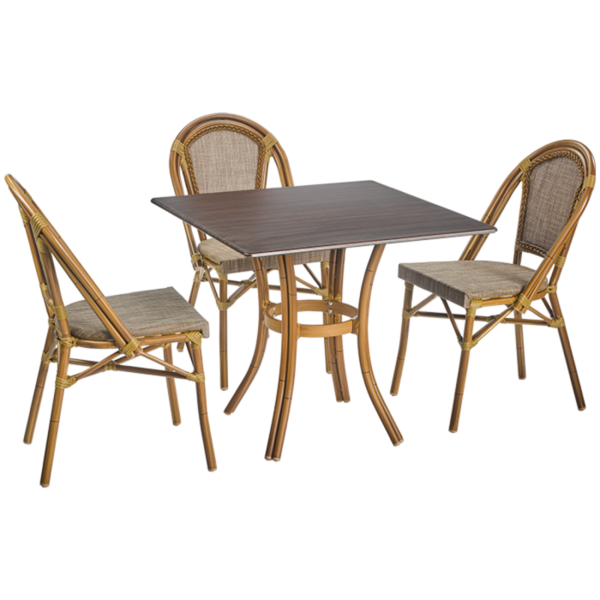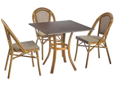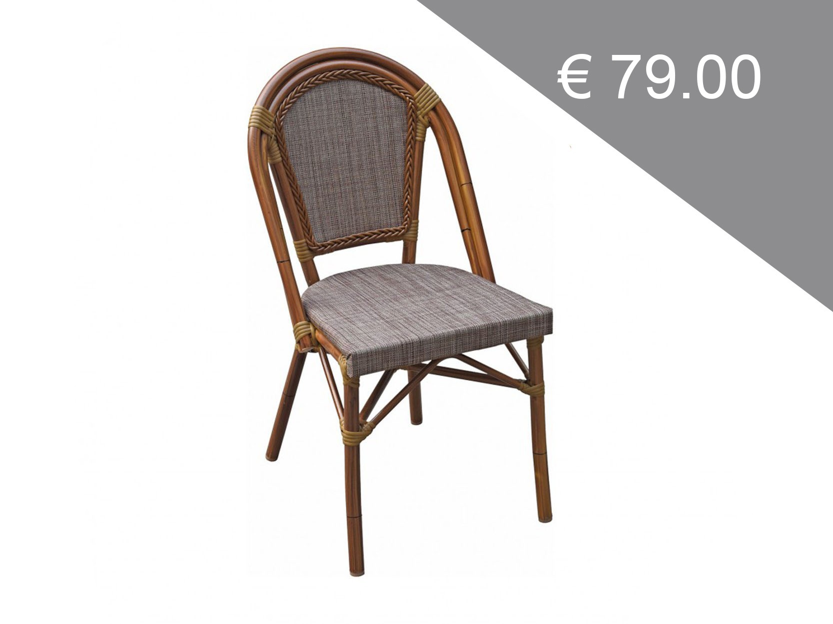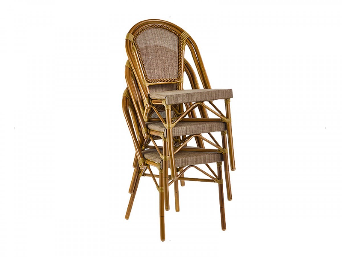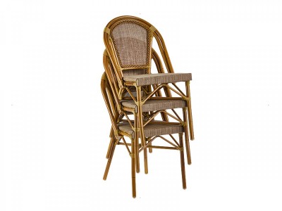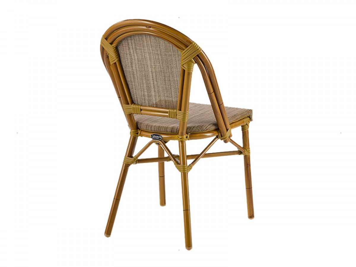 - Scaun de terasă, având cadrul de aluminiu vopsit în câmp electrostatic, de nuanța bamboo.